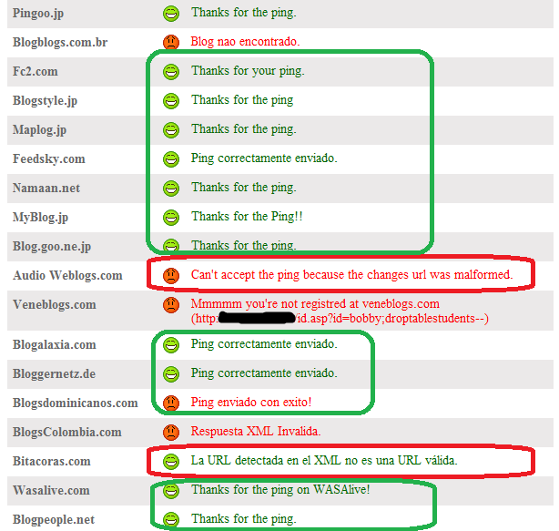 Este servicio permite dar de alta una URL en una lista grande de agregadores, e incluso, de otros servicios de PING. Para hacer esta prueba he enviado la URL de nuestro querido amigo Bobby Tables.