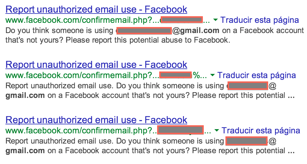Como se puede ver, hay 4.750 registros de URLs de confirmemail.php indexadas con información de correos electrónicos de usuarios que se usan en el sitio para diversas funciones. Si buscamos por correos de Gmail.com, salen unos cientos, con las direcciones de correo indexadas.