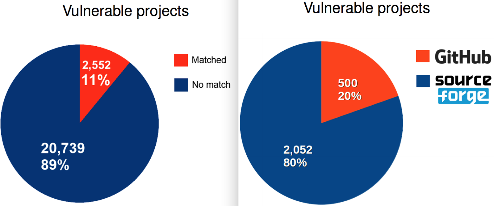 En la presentación hay también resultados de porcentajes de proyectos vulnerables o no con estas tres vulnerabilidades analizadas, y los resultados son bastante malos, tal y como se puede ver en estas gráficas, así que si vas a poner un proyecto Open Source, procura que sea uno mantenido y cuidado – que los hay – y no uno subido y abandonado en su repositorio de código – que los hay -.